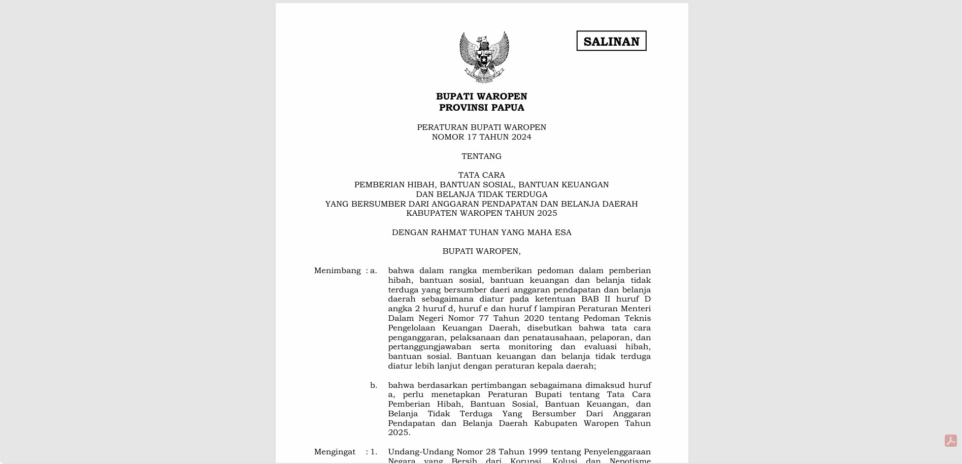 Peraturan Bupati Peraturan Bupati Waropen Nomor 17 Tahun 2024 SALINAN PERBUP NO 17 TAHUN 2024 TTG HIBAH DAN BANSOS TAHUN 2025Download Pages: 1 2 3 4 5